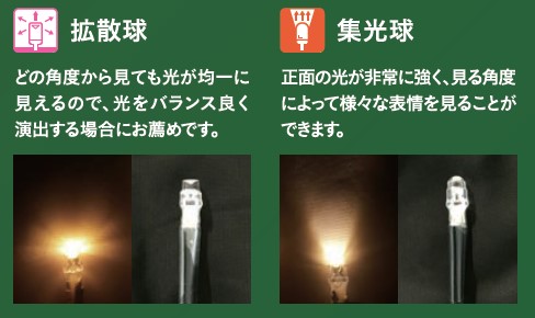 一方、拡散球はLEDから全体に光が広がるため明るく見えますが、集光球と比べるとやや柔らかく、ぼんやりとした印象になります。