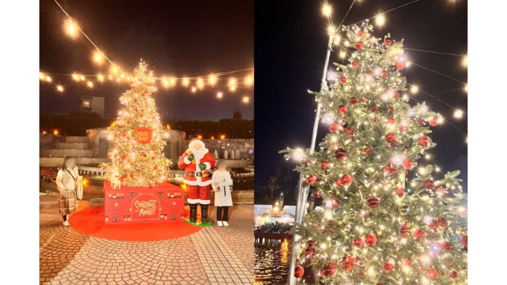 加えて、ツリーに多数配置されたオーナメントボールが、集光球や周囲の光を反射し、輝きを増幅させています。