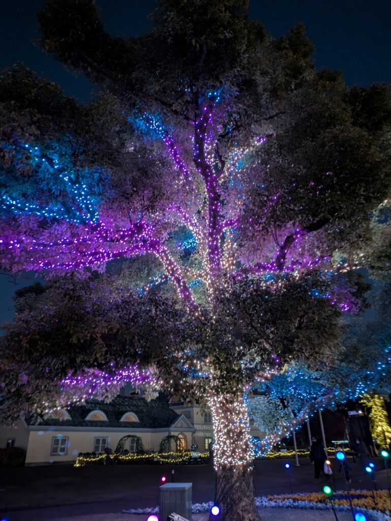紫やブルー、白の光が混ざり合っていて、日本のイルミネーションとしては少し珍しい配色です。