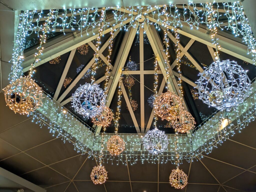 写真からは少し分かりづらいですが、天井から吊るされたイルミネーションボールの中に、ひとつひとつオーナメントが入っています。
