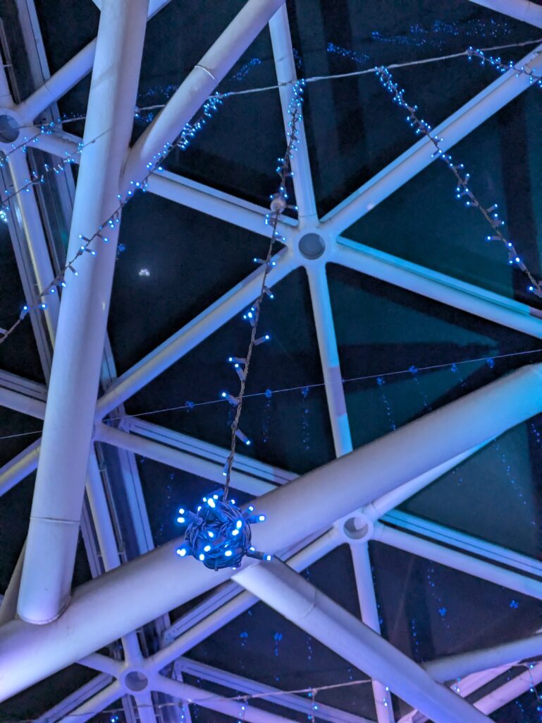 屋根の下にある広い空間全体が、青のストレートライトと演出照明によって、青みがかった幻想的な世界へと変わっていました。