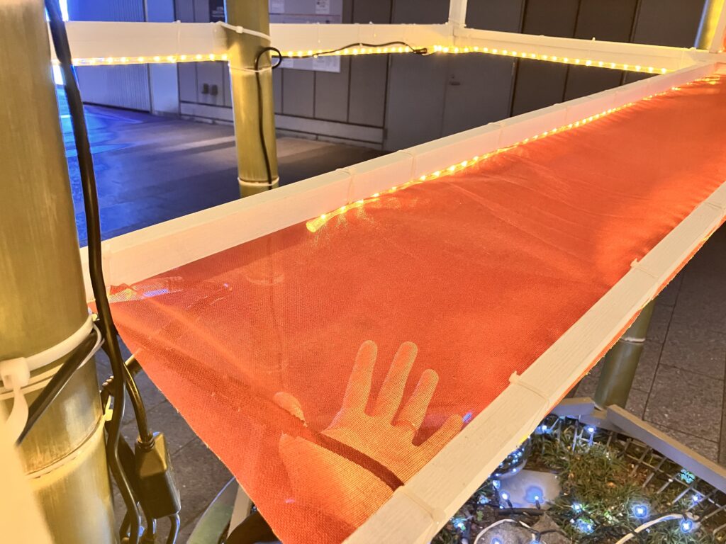 メッシュ素材を使った色表現、竹という素材選び、ロープライトを一本で構成するための黒ビニールテープによる遮光処理など、現場を熟知しているからこその判断が積み重なっています。