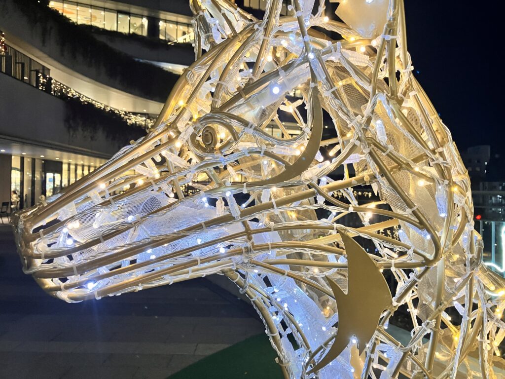 きつねの頭部をよく見ると、白とゴールドのイルミネーションに加え、内部にはゴールドと白、それぞれのメッシュ素材が組み合わされています。