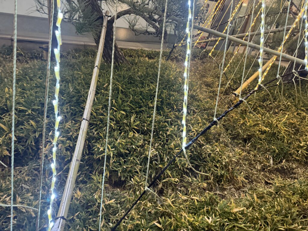 骨組みには竹が使用されており、装飾としての完成度だけでなく、日中に見ても本物の雪吊りのように見えそうな作り込みが印象的でした。
