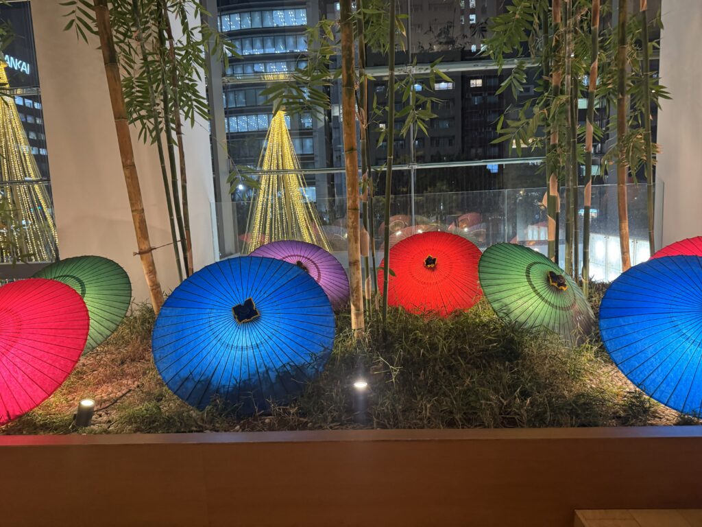 駅構内では、和傘のライトアップ演出も行われていました。