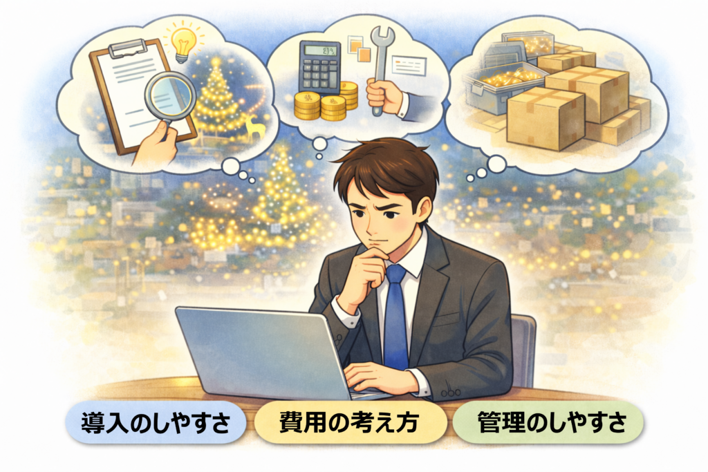 導入のしやすさ・費用の考え方・設置後の管理のしやすさまで含めて検討することで、計画しやすくなります。