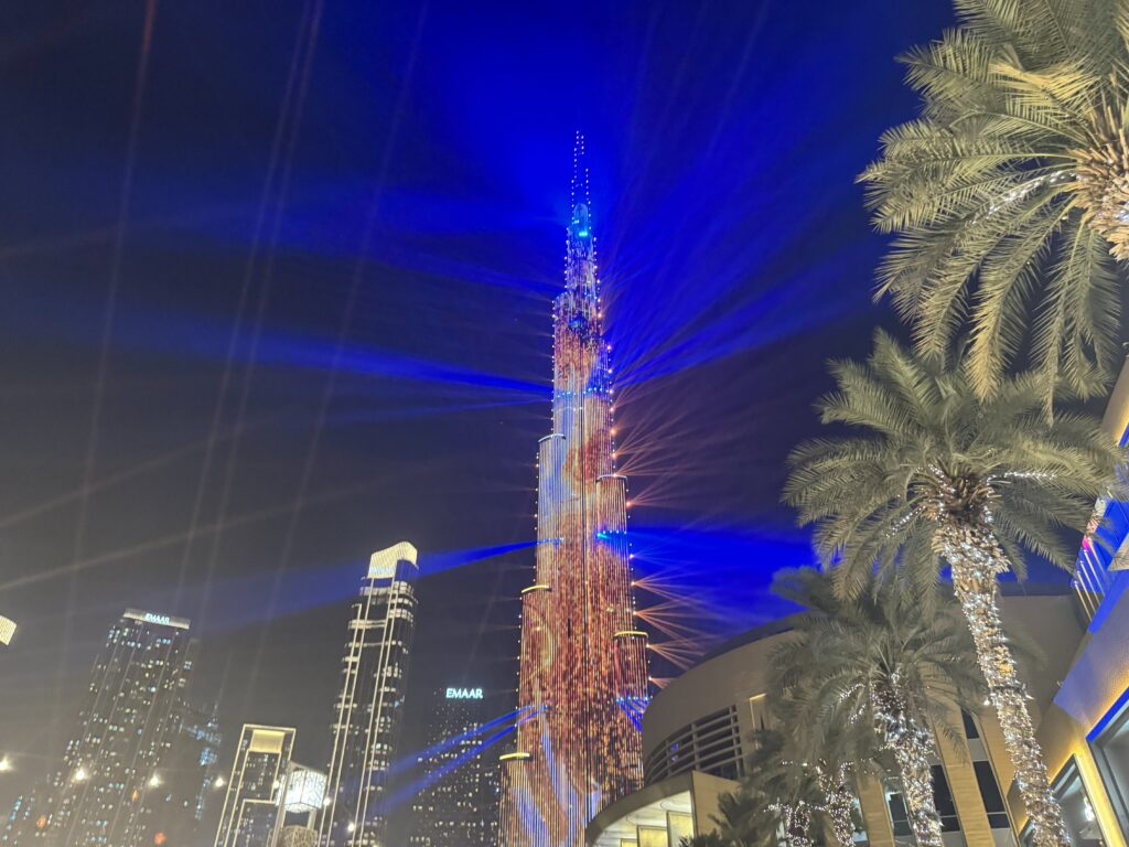 70台以上の高輝度プロジェクターを用い、ビル全体を包み込むメディアファサードと、噴水・火・レーザーが同期する演出は、ドバイでも屈指のデジタルアートです。